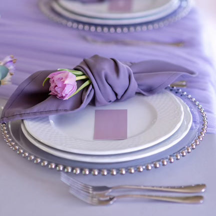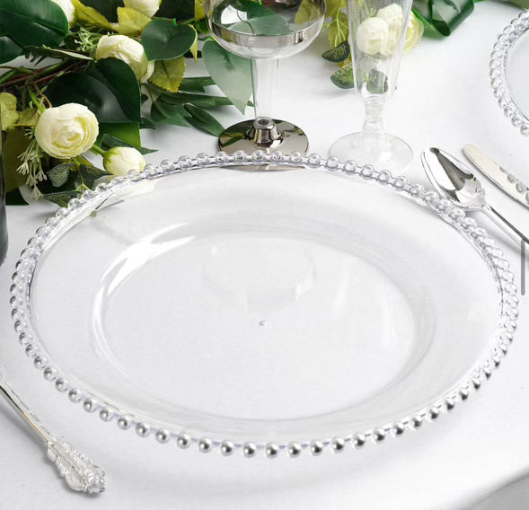 Renting our Acrylic Silver Beaded Charger Plates not only adds a layer of sophistication to your event but also offers a sustainable alternative to purchasing, allowing you to impress your guests without compromising on style or the environment.